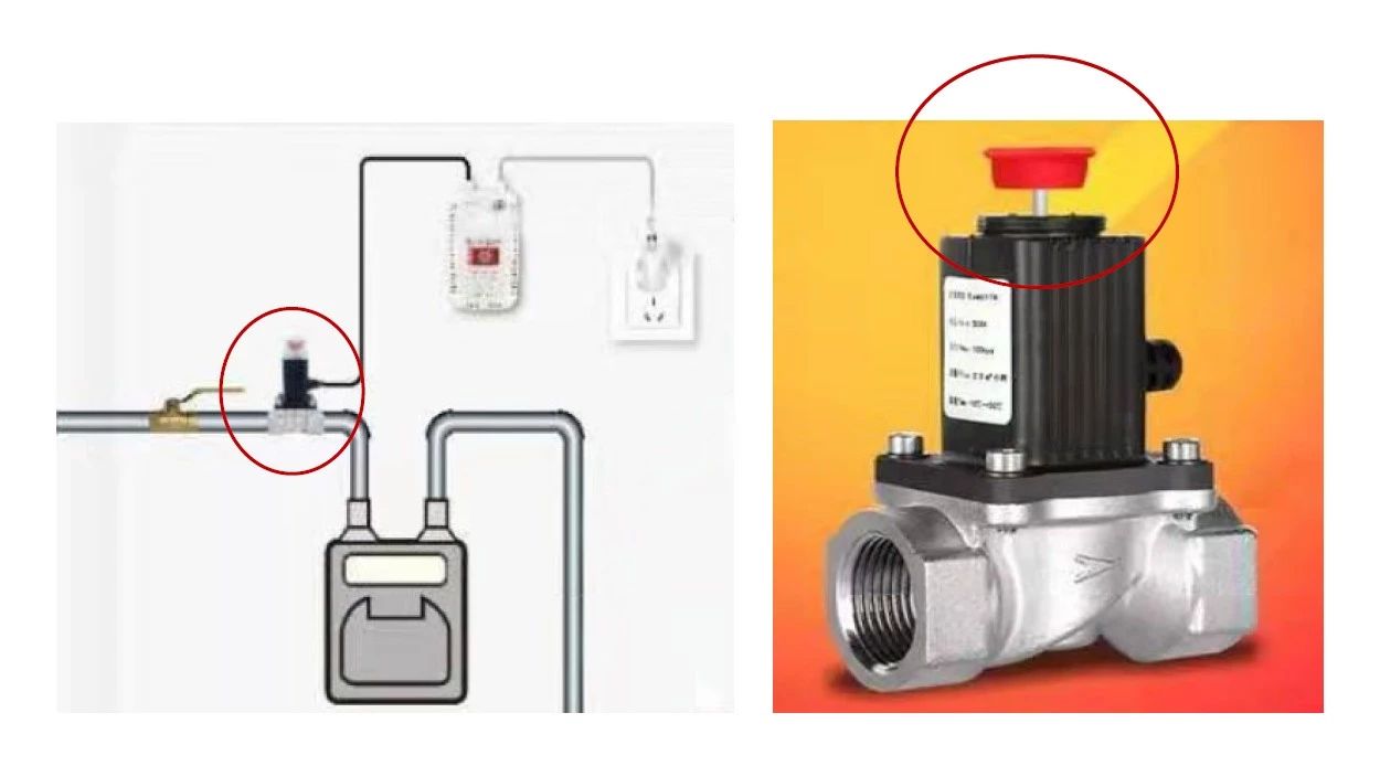 4、如果用戶家裡裝了報警器和聯動的電磁閥(又叫緊急切斷閥),請您檢查電磁閥的紅鈕是否關閉,如🔞關閉,請提起(見下圖);