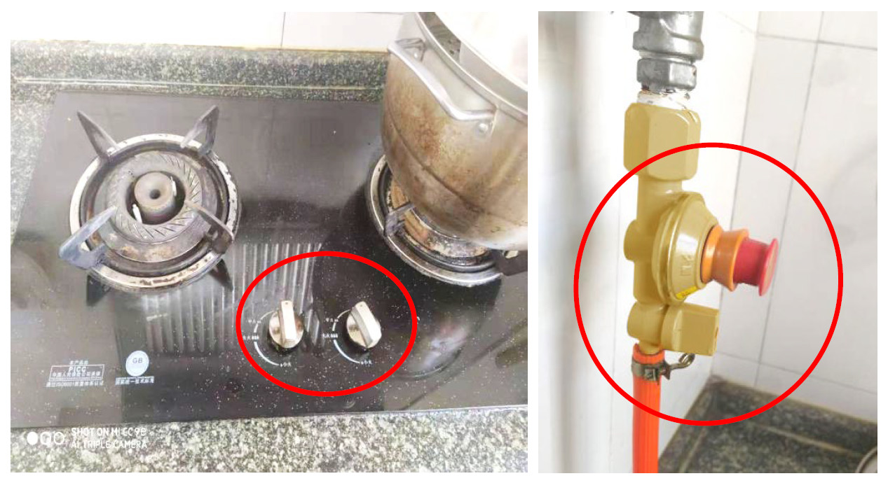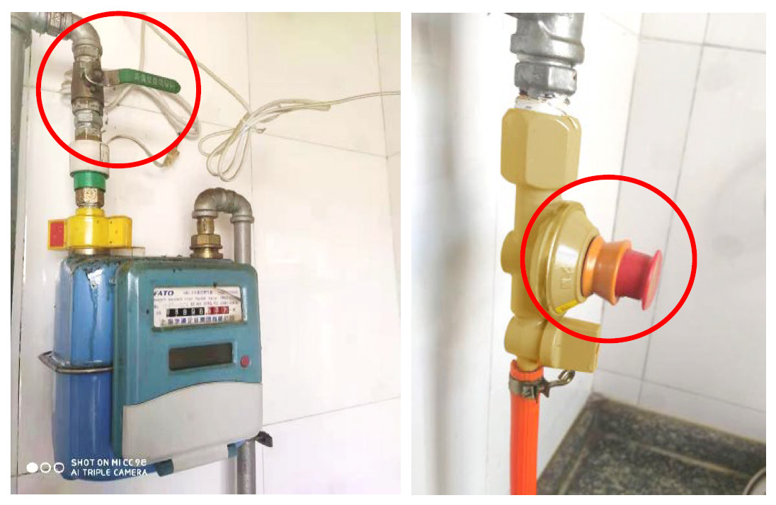1、如果紅色提帽吸回,說明自閉閥後端(竈具、軟管或接頭部位等)有漏氣。請關閉燃氣表前的總開關(下圖左),聯系燃氣公司處理。
